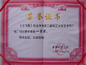 • 金華市第二屆職工文化藝術(shù)節(jié)廠報(bào)刊一等獎