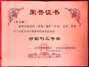 • 今飛報(bào)-選送的《阿婆》稿件(作者:金庫)榮獲2022年度全市內(nèi)部報(bào)刊優(yōu)秀作品評選好副刊三等獎