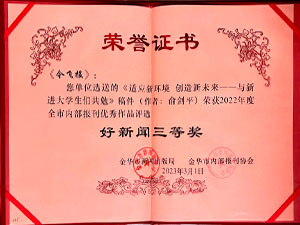 • 今飛報(bào)-選送的《適應(yīng)新環(huán)境 創(chuàng)造新未來——與新近大學(xué)生們共勉》稿件(作者:俞劍平)榮獲2022年度全市內(nèi)部報(bào)刊優(yōu)秀作品評選好新聞三等獎