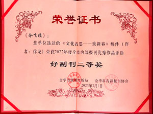 • 今飛報(bào)-選送的《文化淺思——致新春》稿件(作者:徐龍)榮獲2022年度全市內(nèi)部報(bào)刊優(yōu)秀作品評選好新聞三等獎